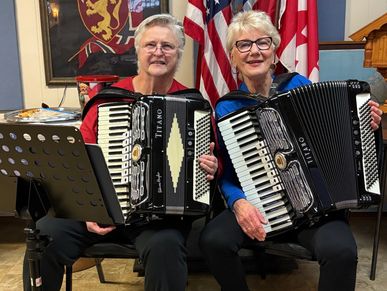 Delette Huffman and Bev Spurgeon played for three settings of Lutefisk Dinner diners at Kelso, WA Sons of Norway Hall. It was a fun-filled day of Scandinavian tunes. Bev even overcame her fear of cod and tried a bite of lutefisk!